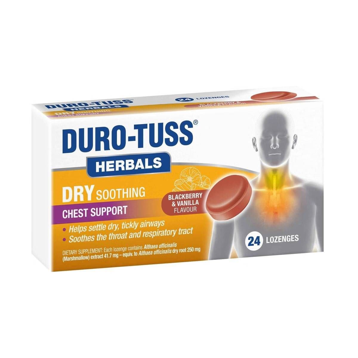 Duro-Tuss Herbals Dry Soothing Lozenges are an on-the-go herbal formula to help settle dry, tickly airways and scratchy throats. These lozenges contain the herbal extract marshmallow root which works by forming a soothing coating over the throat lining, helping settle dry, tickly airways. They’re convenient to carry and use throughout the day, making them an ideal choice for busy lives. Blackberry and vanilla flavour.